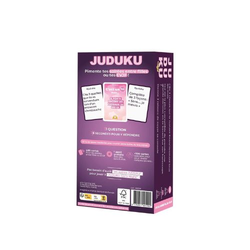 Révèle, en 8 secondes, les pires pensées de tes amies avec des cartes demandant de la spontanéité, peu de morale et aucune retenue ! La première joueuse qui marque 7 points est élue "Queen du Juduku" !