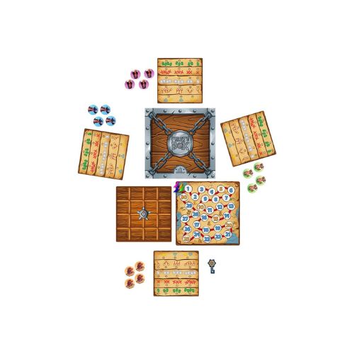 Matériel : 16 dés Objet Précieux, un coffre, 1 plateau Grille, 24 jetons Pirate (6 de chaque couleur), 1 jeton Clé, 4 pions Perroquet (1 de chaque couleur), 4 cartes Parchemin, 1 carte Richesse, 1 sablier de 30 secondes et les règles du jeu.