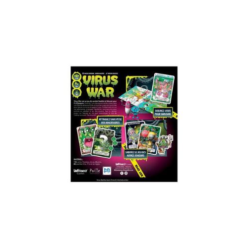 Virus War est un jeu de cartes familial, rapide et plein d'interactions, où chaque joueur incarne un virus mutant déterminé à infecter et dominer le monde microbien ! Mais attention : entre mutations, traitements, et coups bas, seul le virus le plus rusé survivra à cette guerre biologique délirante !